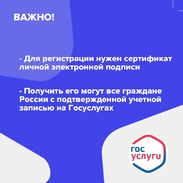 Важно: для регистрации нужен сертификат личной электронной подписи. Получить его могут все граждане России с подтвержденной учетной записью на Госуслугах.